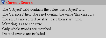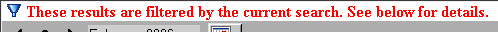 When a search is submitted the program returns to the calendar display as normal, however all subsequent views are filtered by the search criteria until the filter is cleared. The end user may navigate the calendar exactly as before however only events matching the query are displayed. To remind the user that a filter is in effect a prominent indicator will appear at the top and bottom of the display.